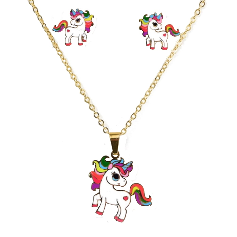 Unicorn rainbow kids necklace bracelet set stretchy. No